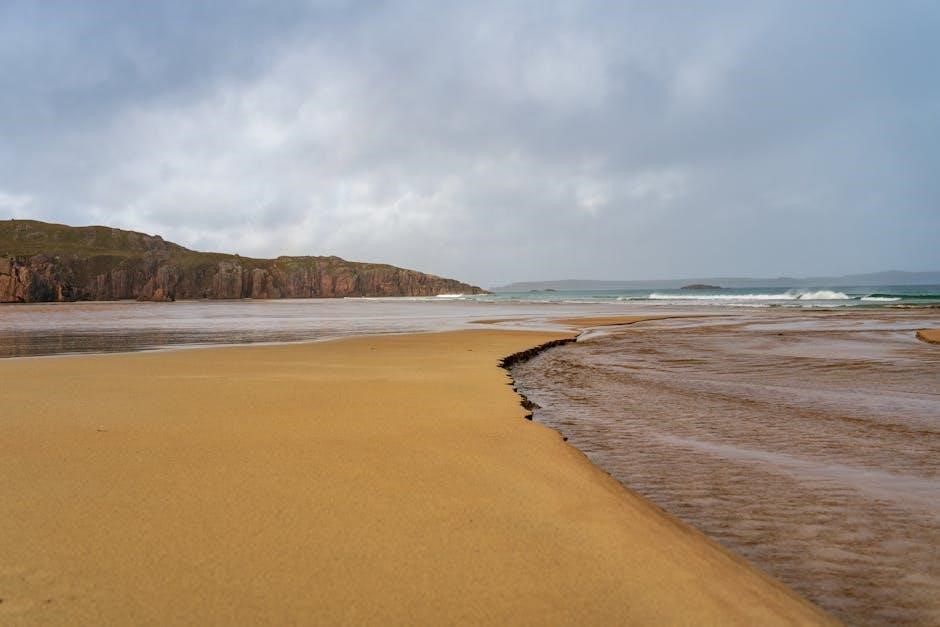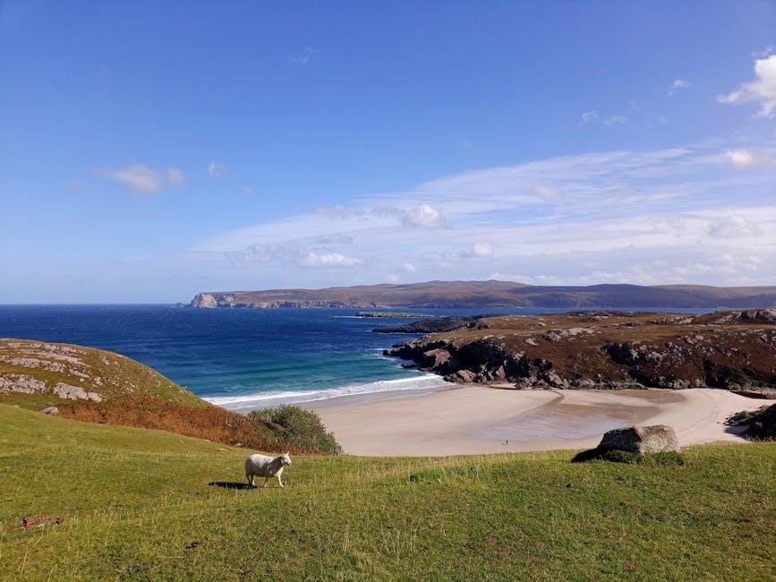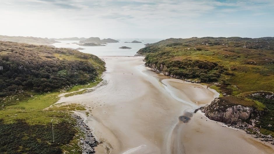 The bay boasts a vast expanse of golden sand, backed by towering dunes and dramatic cliffs․ Destination NC500 emphasizes Sandwood Bay’s wild and untamed character, perfect for those seeking tranquility and escape․ Keep an eye out for the sea stack, Am Buachaille, rising from the waves․